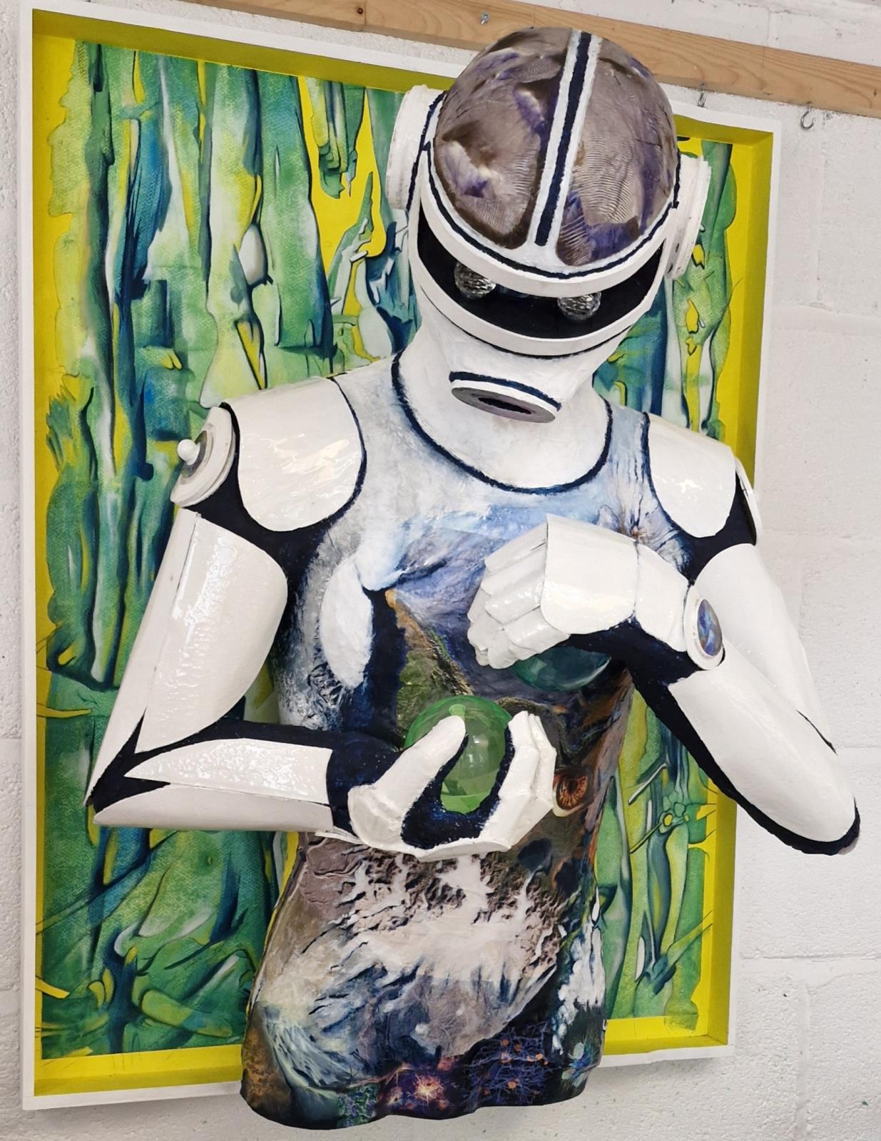 Three acrylic paintings and Alien wall sculpture in paper and card.