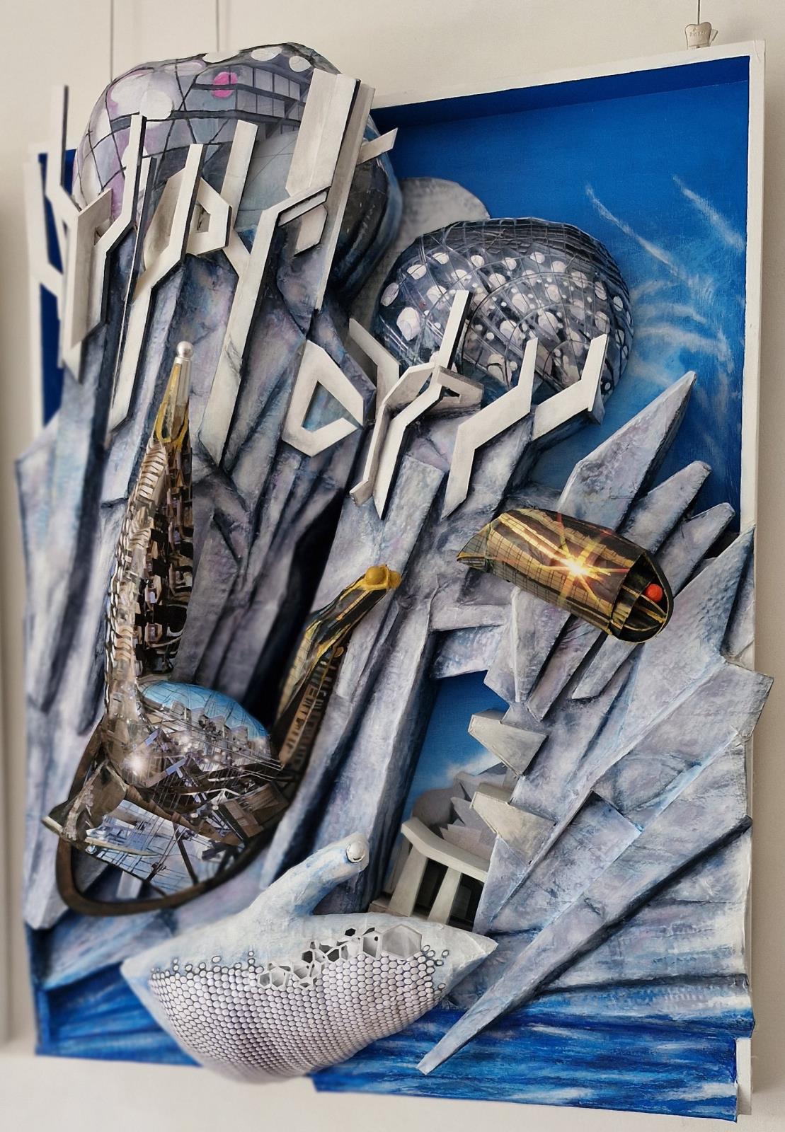 Large, five-panel, wall sculpture, Neuworld, based on novel.